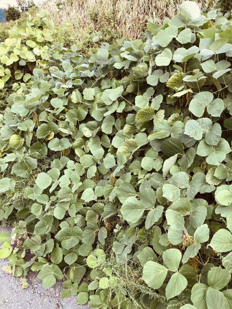 - 特徴: マメ科の多年草。地下に巨大な塊根(根っこ)を持ち、非常に繁殖力が強いのが特徴です。夏場に急速に成長し、道路脇や休耕地、法面などをあっという間に覆いつくします。他の植物に絡みつき、光を遮って枯らしてしまうこともあります。葉は大きく、葉裏は白っぽい毛で覆われています。葛粉は根から作られます。