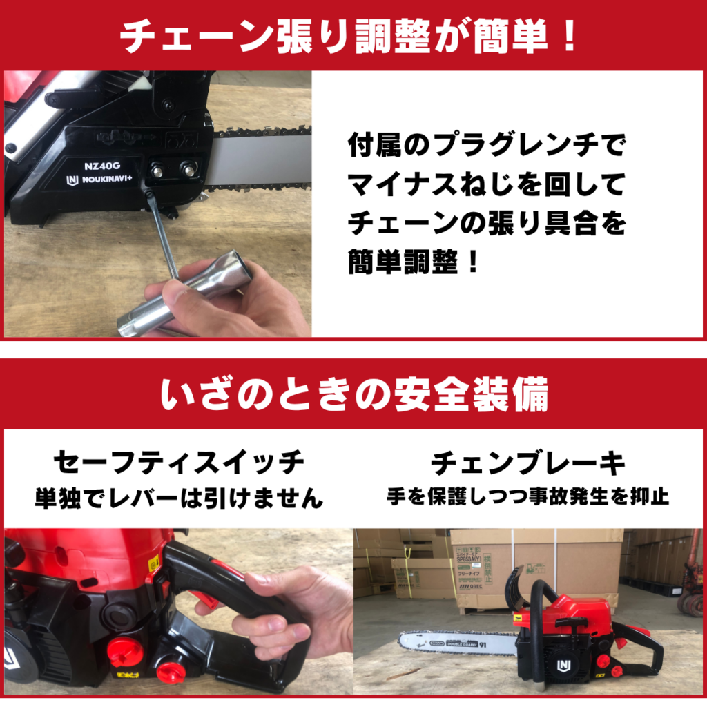 ヘルメット・ゴーグル・防護ズボン・手袋など、安全装備は必須です。 安全装備をつけずに作業することお勧めです。