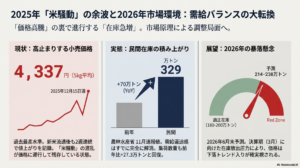 長年、日本のコメ作りは「価格低迷」に苦しんできました。しかし、政策が「供給絞り込み」へ転じたことで、少なくとも2026年産の新米が出る秋頃までは、この高値圏が続く可能性が高いでしょう。