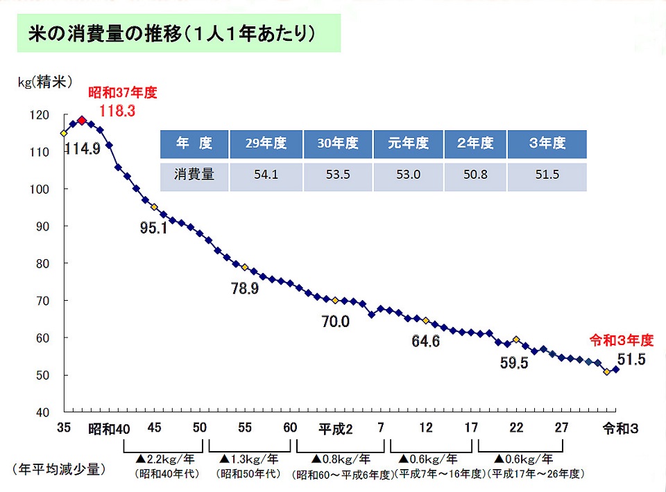 日本人1人あたりの年間コメ消費量は、1962年の118kgをピークに減少を続け、2026年時点では約50kg前後まで落ち込んでいる。