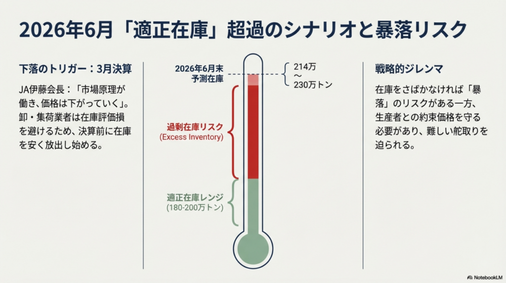 農林水産省の見通しでは、2026年6月末の民間在庫は214〜230万トンに達する可能性があるとされており、適正水準(180〜200万トン)を明確に上回ります。(詳細はこちら)