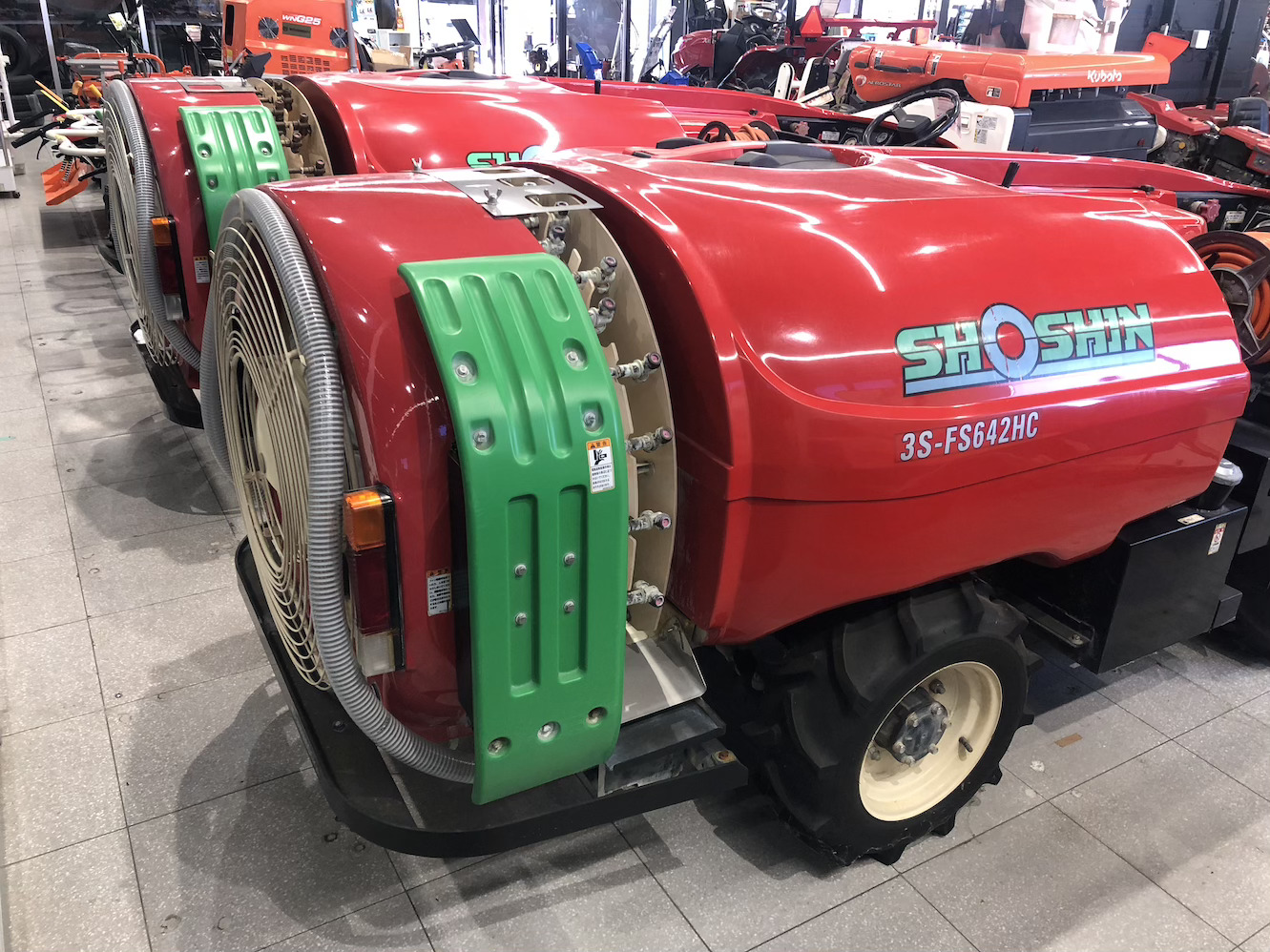| 3S-CH640HX | 棚園〜立ち木向き | 27.1kW | 600L | 94L/分 | 700⇔430m³/分 | 平成26年排ガス規制対応ディーゼルターボエンジン。HST走行、自動給水ストップ機能。(株式会社ショーシン) |