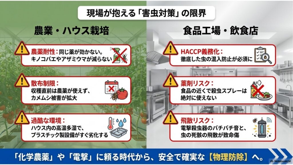 こうした問題が重なり、農薬だけに頼る防除では安定した栽培が難しくなってきました。