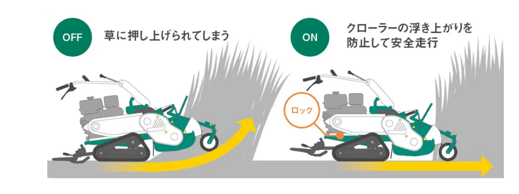 - 新機能「クローラーロック」: 刈取部をワンタッチでロック。背丈の高い草や密集地でもロータリーが浮き上がりを防ぎ、安定した走行と草刈りを可能にします。