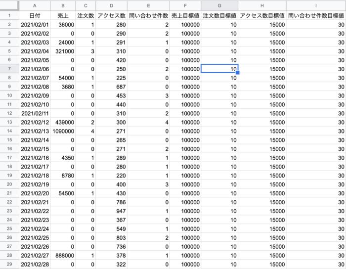 そしてさらに、2月度の目標値を設定しておきます。目標の達成度合いを確認できるようにします。